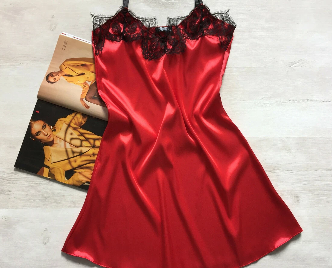 Женский атласный пеньюар с кружевом красный