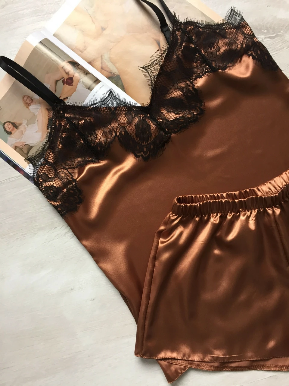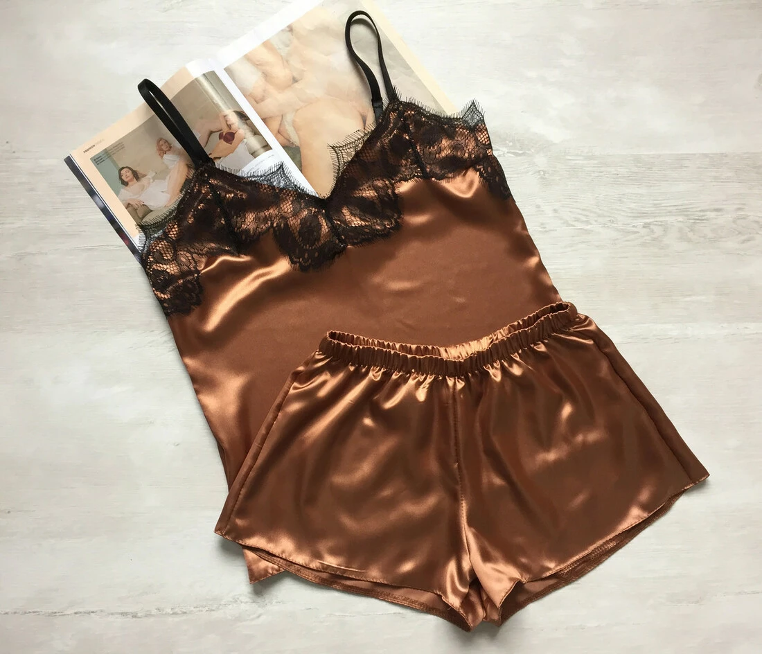 Женская атласная пижама майка шорты с кружевом бронза