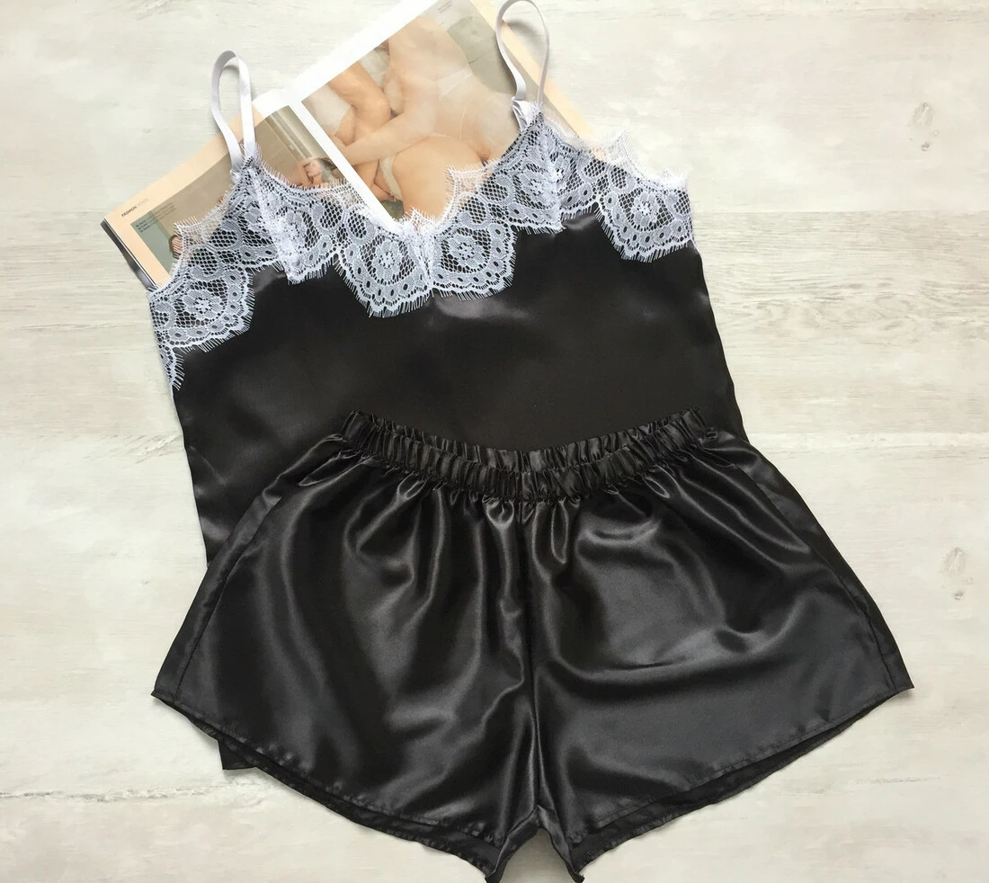 Женская атласная пижама майка шорты с кружевом черная