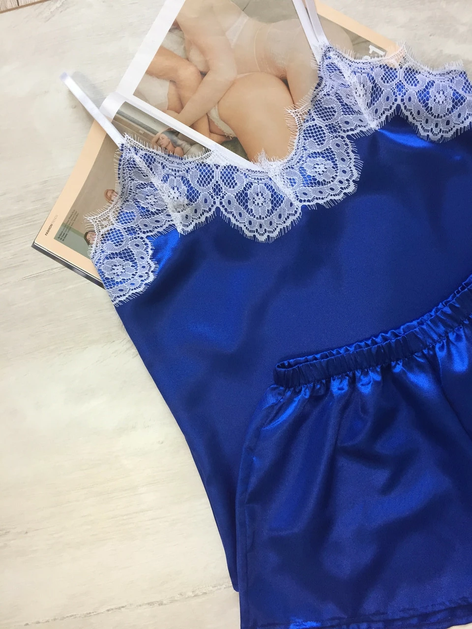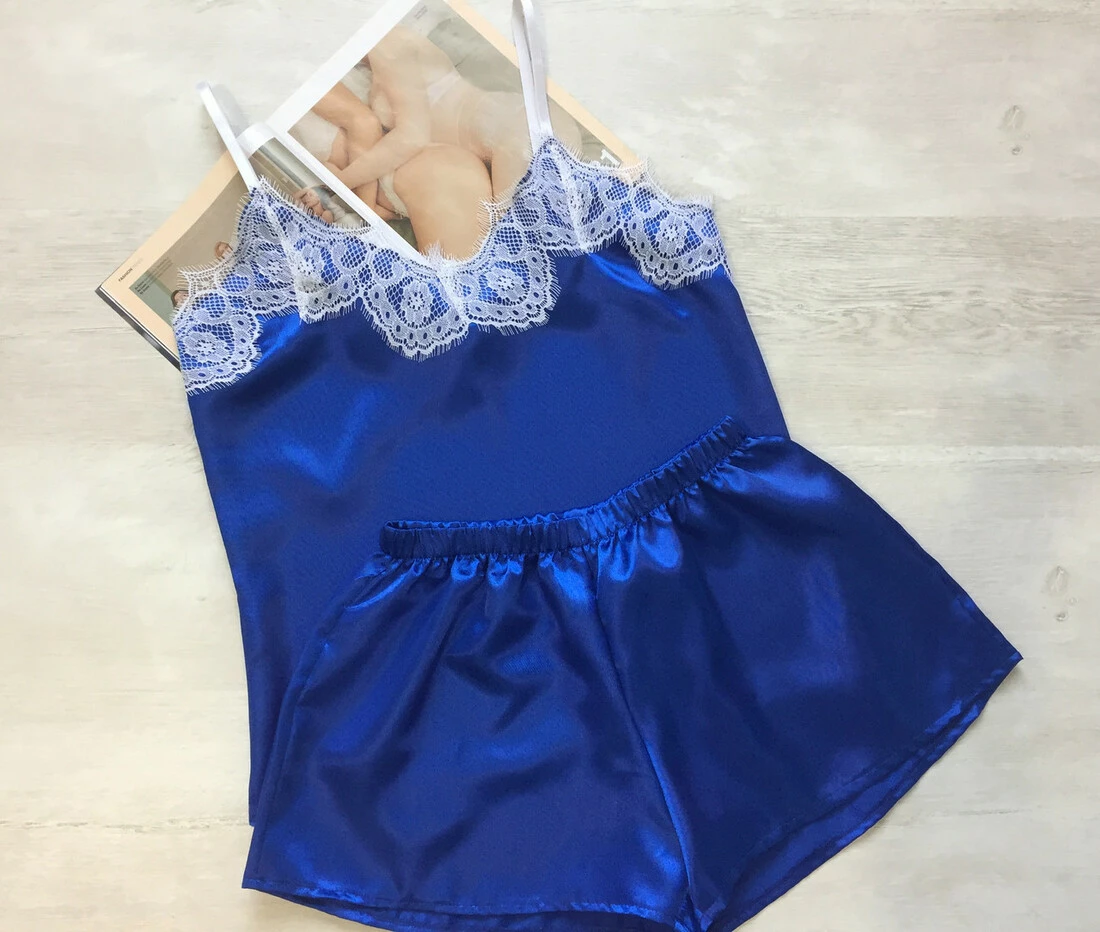 Женская атласная пижама майка шорты с кружевом електрик