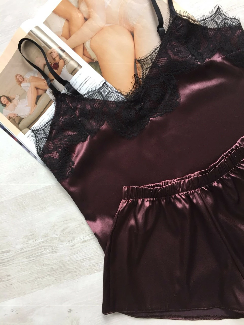 • Комплект выполнен из атласной ткани, комплект приятный к телу