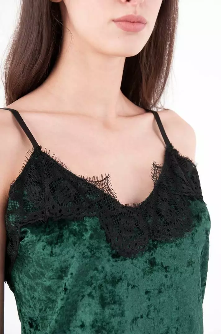 • Майка на тонких бретелях, верх украшен нежным французским кружевом.