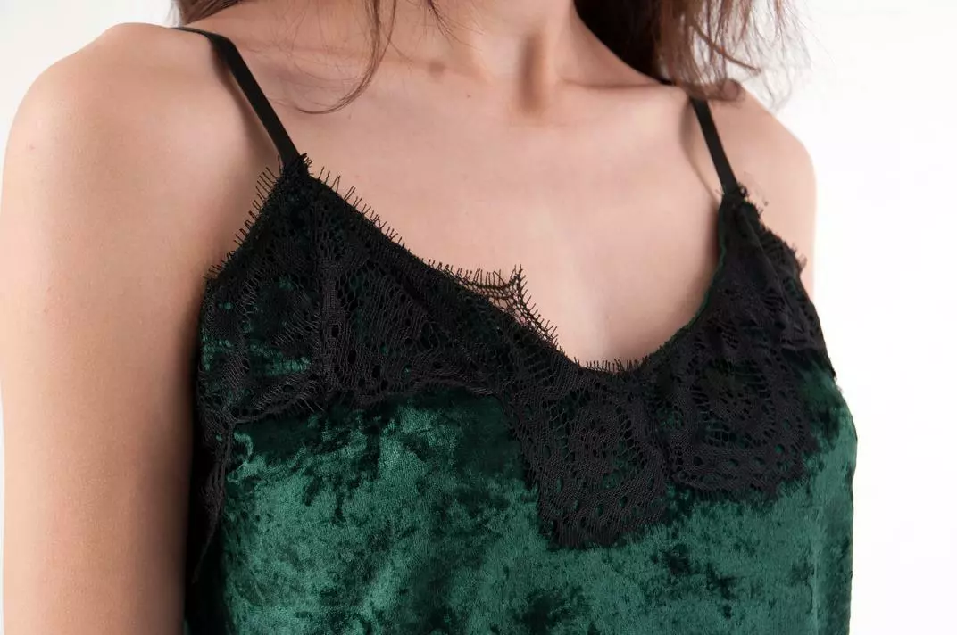 • Майка на тонких бретелях, верх украшен нежным французским кружевом.