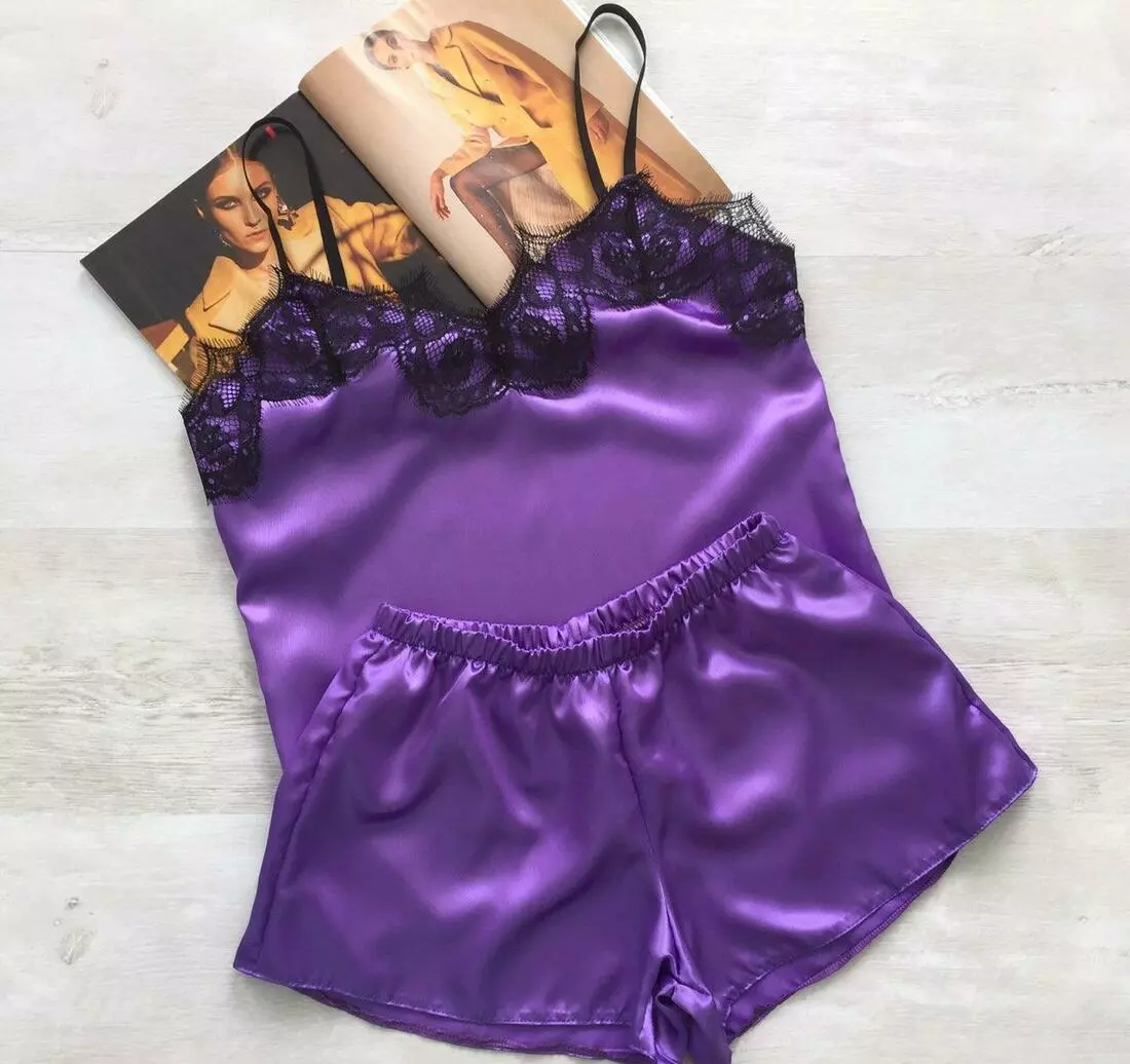 Женская атласная пижама майка шорты с кружевом фиолетовая