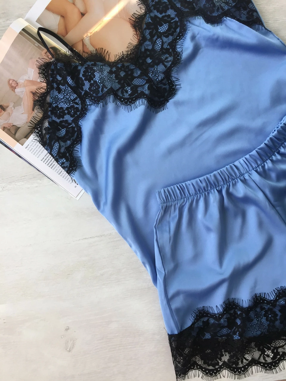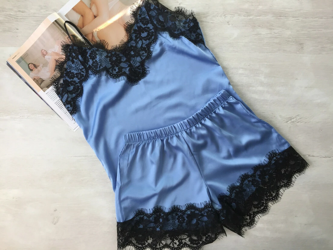 Женская пижама шелковая майка и шорты голубая