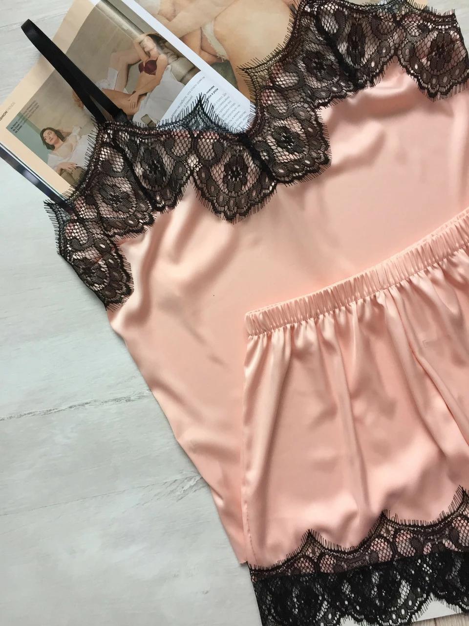 • Майка на тонких бретелях, вверх украшен нежным французским кружевом.