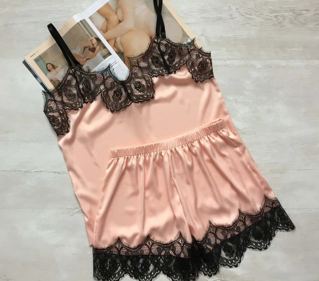 Женская шелковая пижама майка и шорты персик