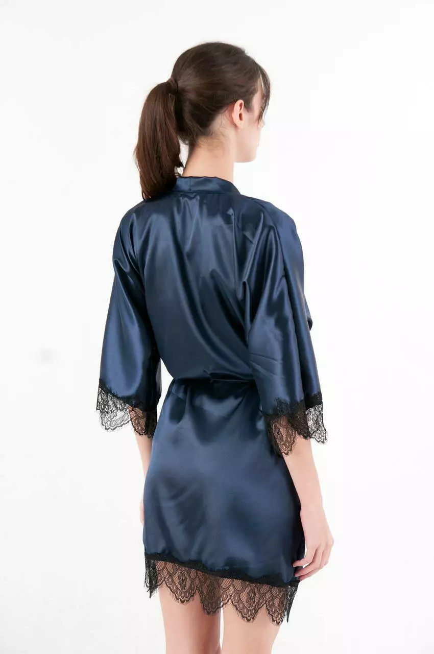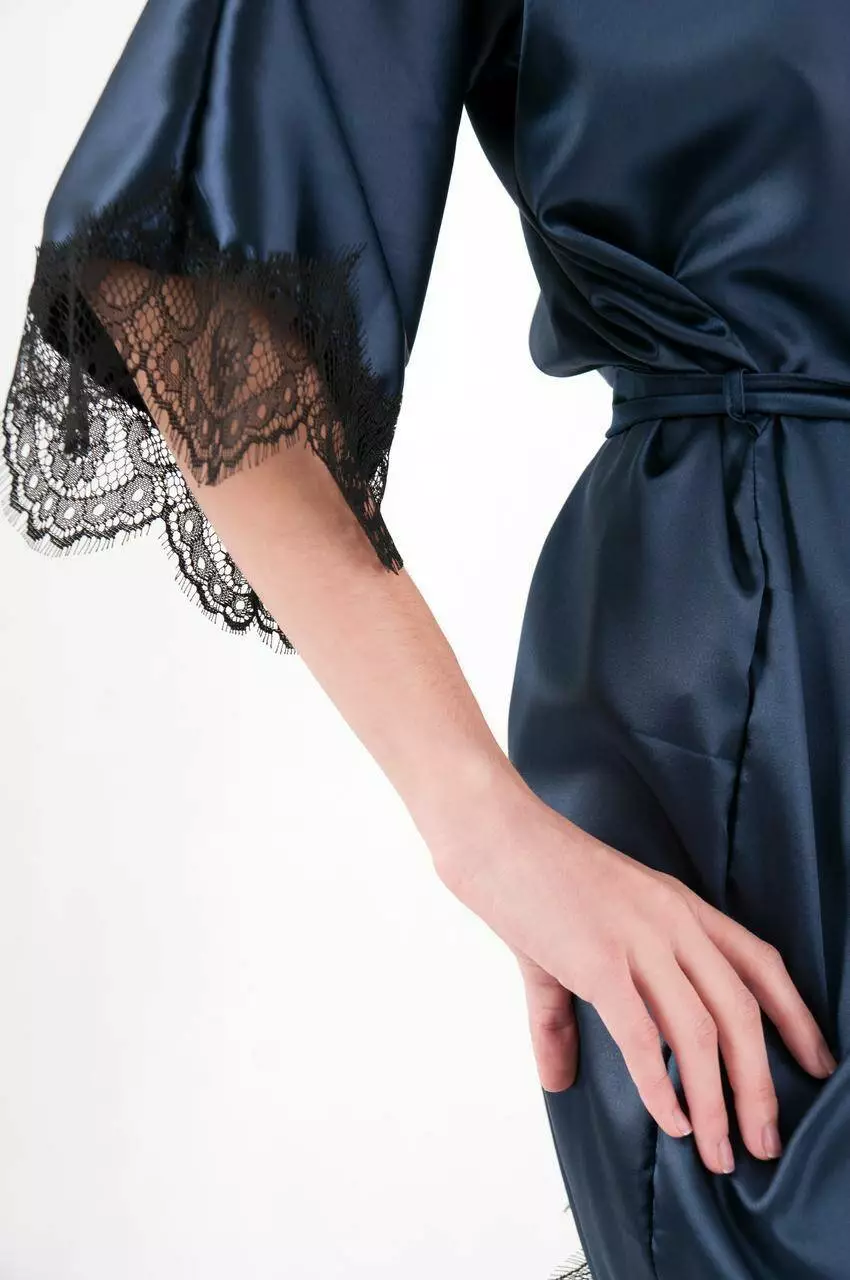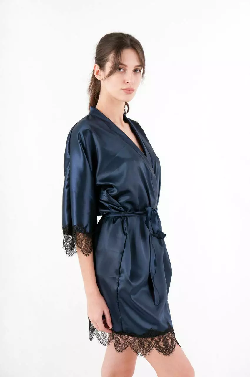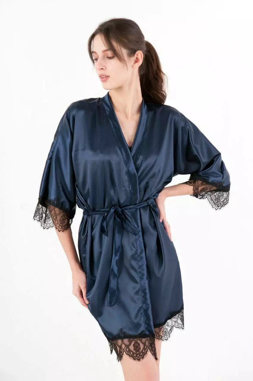Женский атласный халат с поясом на запах темно синий