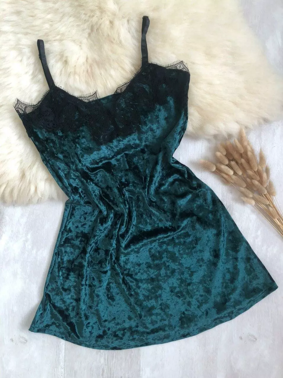Женский пеньюар велюровый с кружевом зеленый